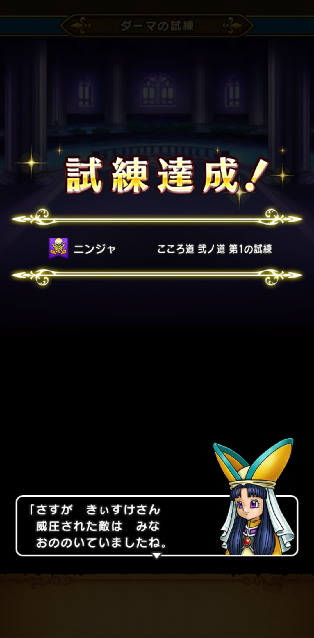 またクソめんどくさい手間のかかる試練ですが、これは素直に攻略を見て、ニンジャ四人パーティ(一人以外全部レベル1)にして防具外して、少しだけ弱めの敵が出る地図にしてひたすら防御…なにこれクソつまんない試練1個目何とか終わりました。