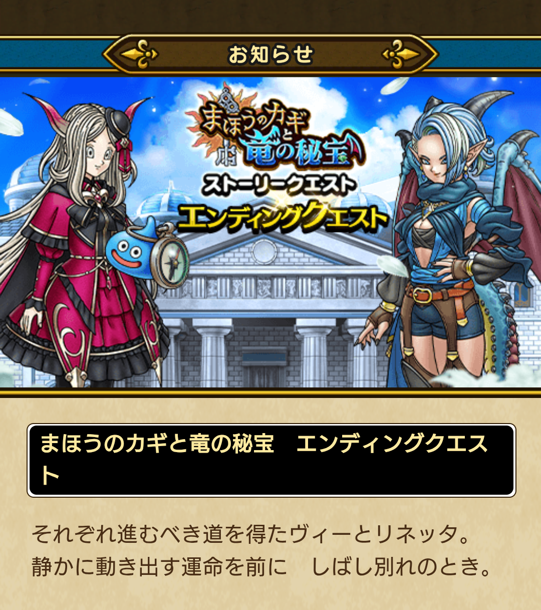 2026-3-5 22:44:17534 字 【DQW】まほうのかぎイベント エンディングクエスト あっという間にエンディングですね イベントとしてはそこまで難易度は高くなく、宝箱に入ったアイテムはほぼ回収できました。 服がかわいくて満足。 以下、エンディングクエストのです。 続きを読む 待って待って~リネッタもヴィーさんも、また出てきてくれそうじゃない? しかも、リネッタ、とうとうあの世界から出てきてるんですけど!! もしかして、ハーフアニバこのお話やってくれたり…する??? それとも、次の章までお預けかな? 世界竜と奇跡の仔の話ですし。 どちらにせよ、この二人がまた出てきてくれると思うととてもうれしい。好きなキャラなので! そうそう、初めて当たったメタルの盾、なかなかに耐性がついてて良いですね。 あとリネッタの杖も当たったので、めっちゃうれしいです。強化された大魔道士ではなつと、20万超えたりしてました。笑ってしまう デュフフ ゴルパス半額予告来たので、買おうかな~ リネッタの防具もですけど、ヴィーさんの装備もほしいんですよね。貴重なブレス強化の防具なので。 マイレージ、どちらも引いてこうかなと思います。 次のイベントはなんだろ?たたむ